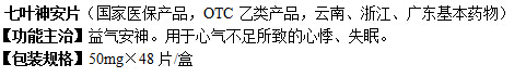 七葉神安片(國家醫(yī)保產(chǎn)品,OTC乙類產(chǎn)品,云南、浙江、廣東基本藥物) 【功能主治】益氣安神。用于心氣不足所致的心悸、失眠。 【包裝規(guī)格】50mg×48片/盒