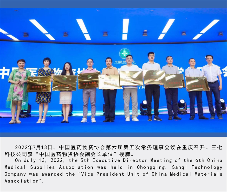 2022年7月13日,中國醫(yī)藥物資協(xié)會第六屆第五次常務理事會議在重慶召開。三七科技公司獲“中國醫(yī)藥物資協(xié)會副會長單位”授牌。