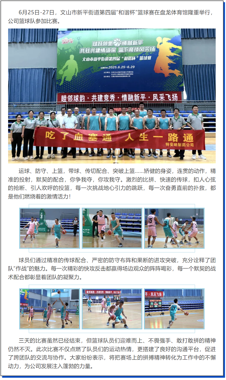 6月25日-27日,文山市新平街道第四屆“和諧杯”籃球賽在盤(pán)龍?bào)w育館隆重舉行,公司籃球隊(duì)參加比賽。